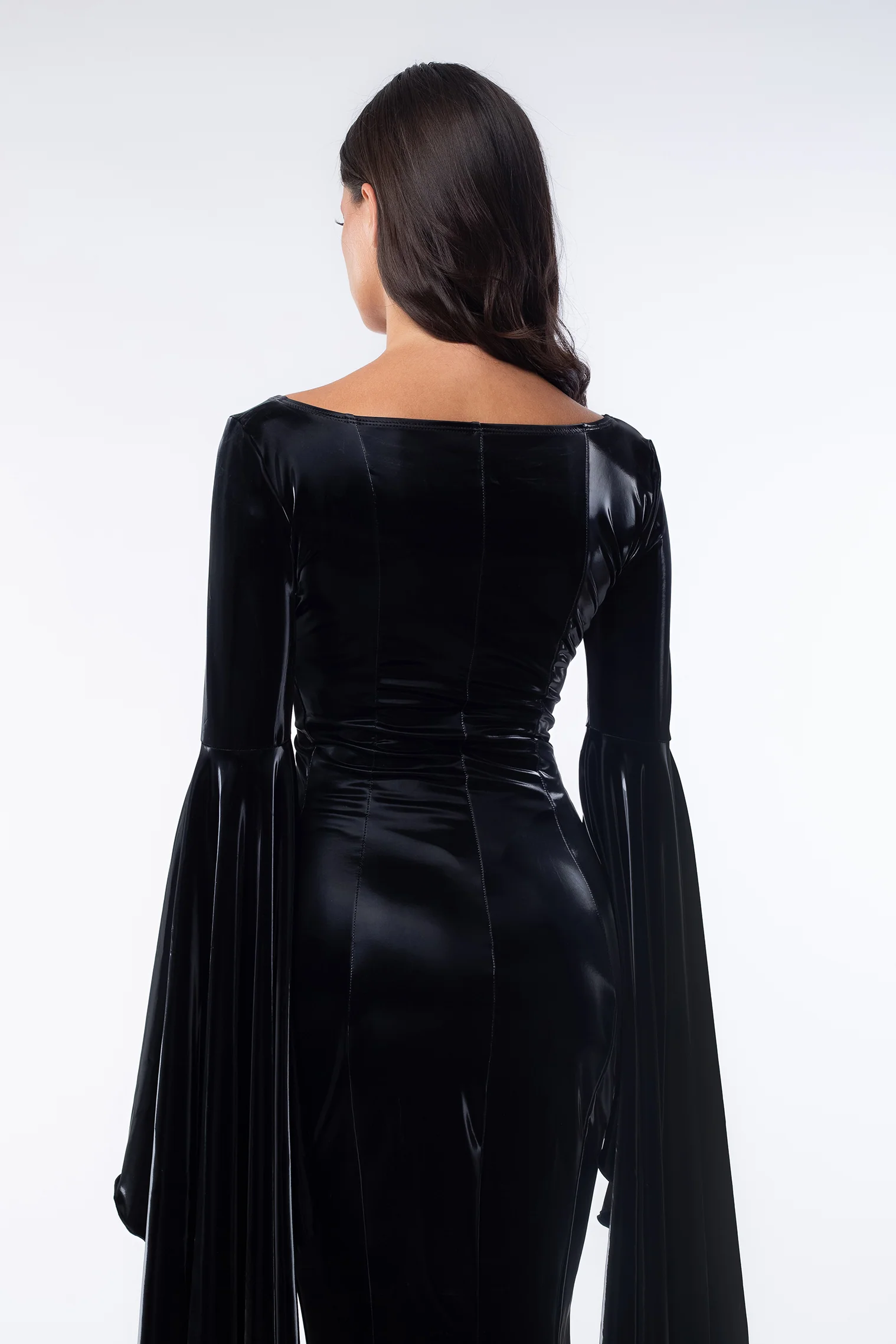 Darkness meets elegance to create the embodiment of Gothic beauty & mystical charm. The gorgeous shiny fabric melts on your skin, while the dramatic sleeves follow your every move.