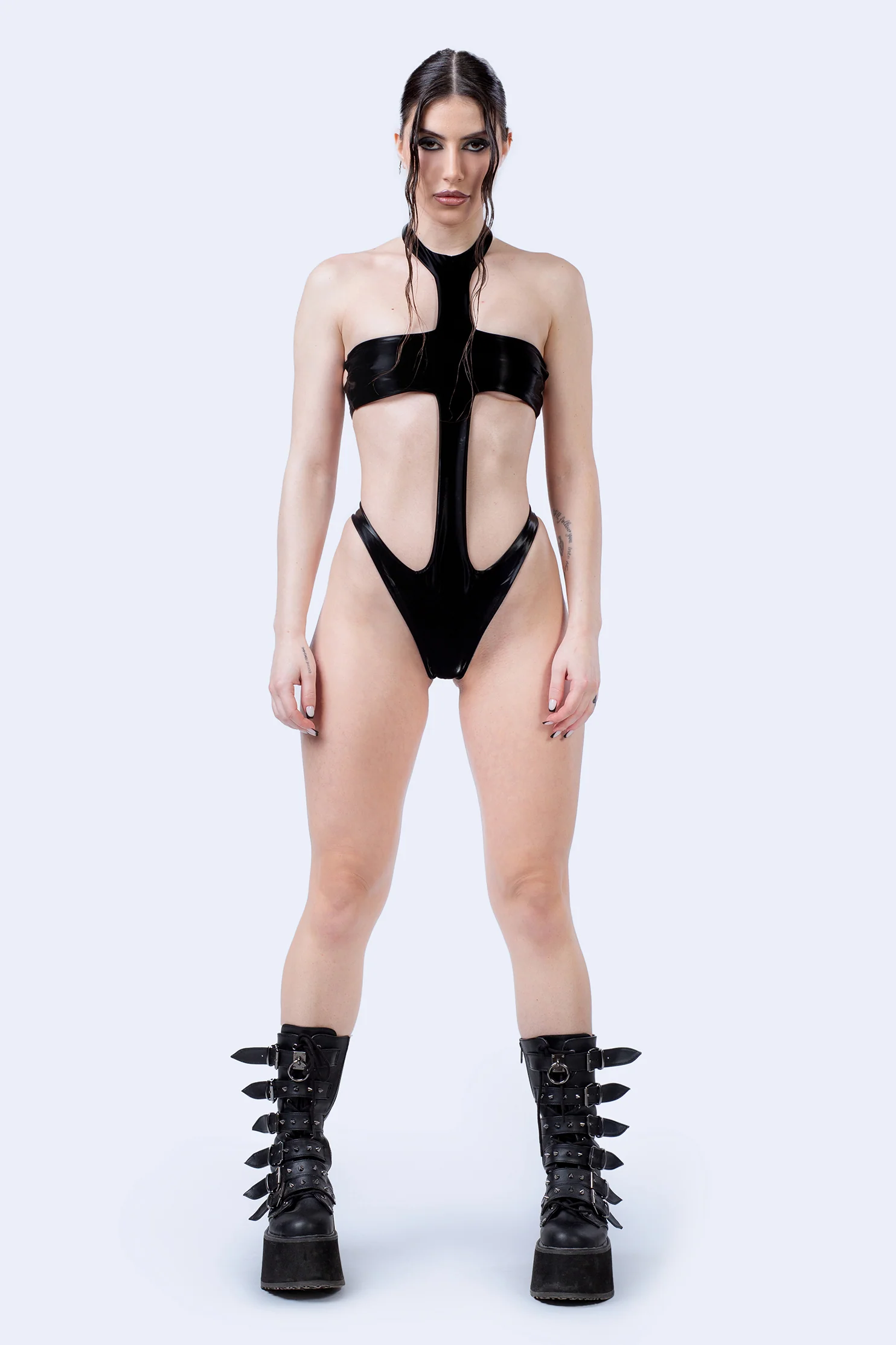 A dash of otherworldly style with a high contrast of glossy black on bare skin. The strappy construction leaves just enough the imagination while elongating your figure and showing off your best assets.
